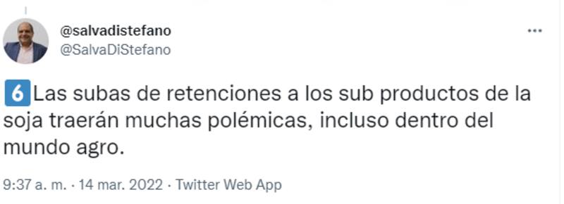 Mientras el presidente Alberto Fernández define los últimos detalles con el ministro de Agricultura, Julián Domínguez, Di Stefano advirtió en Twitter que la suba en las retenciones "dejará sin duda una caída en los ingresos de dólares".