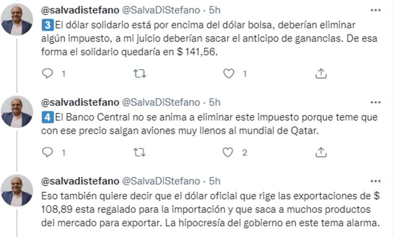 "El dólar solidario está por encima del dólar bolsa, deberían eliminar algún impuesto, a mi juicio deberían sacar el anticipo de Ganancias. De esa forma el solidario quedaría en $ 141,56. El Banco Central no se anima a eliminarlo porque teme que con ese precio salgan aviones muy llenos al mundial de Qatar. Eso también quiere decir que el dólar oficial que rige las exportaciones de $108,89 está regalado para la importación y que saca a muchos productos del mercado para exportar. La hipocresía del Gobierno en este tema alarma", amplió Di Stefano.