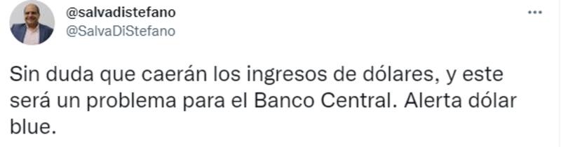 "Sin duda que caerán los ingresos de dólares, y este será un problema para el Banco Central. Alerta dólar blue", señaló.