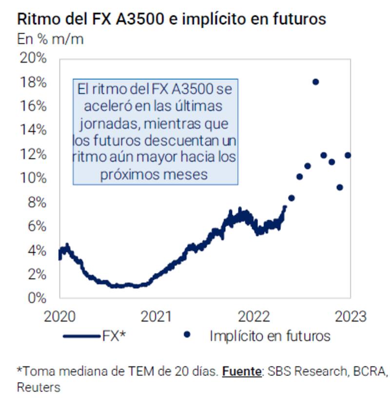 Lisandro Meroi, analista de Research de TSA Bursátil, detalló que la curva de futuros de Rofex marca un ritmo de depreciación mensual promedio en torno a +12%, algo disociado del deslizamiento que viene llevando adelante el BCRA.