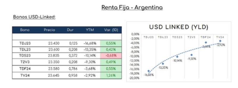 "Esa demanda llevó a que los bonos rindan en negativo. Creemos que las tasas pueden seguir profundizando el terreno negativo ante la expectativa de un salto en el tipo de cambio oficial. Los bonos dólar linked están devengando una tasa interesante ya que el Banco Central está acelerando el crawling peg", explicó.