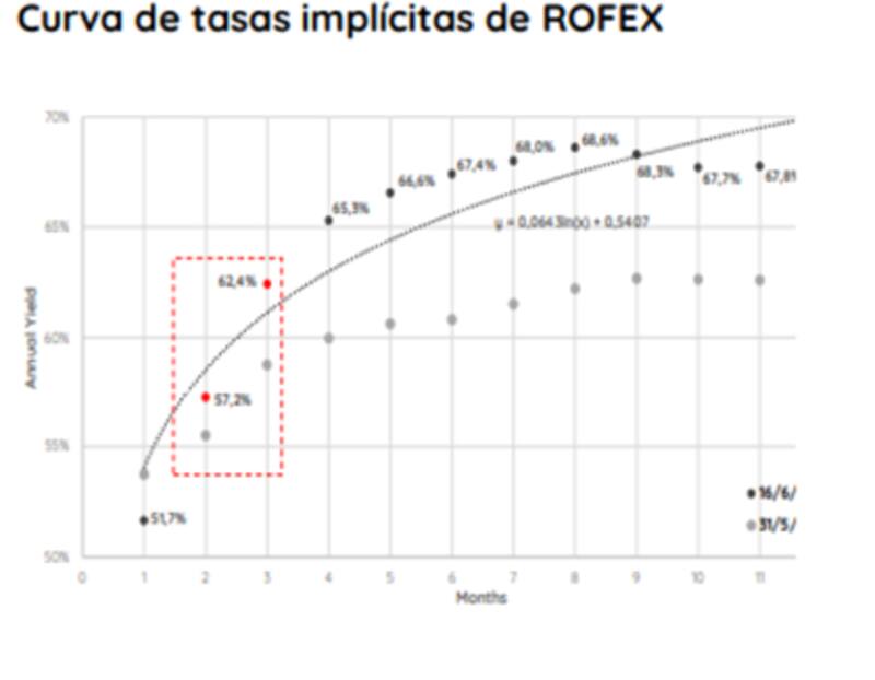 A comienzo de mes, la curva de dólar Rofex operaba con tasas del 60% al 63% para los próximos 4 a 11 meses. Pero en la actualidad, saltaron del 65% al 67% para ese mismo período, lo cual implica una mayor expectativa de devaluación desde el segundo semestre en adelante.