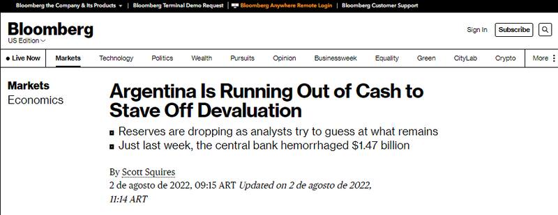 El portal de la compañía estadounidense de asesoría financiera Bloomberg alertó por la sangría de reservas que muestra hoy el Banco Central de la República Argentina (BCRA), lo que acelera aún más el desarrollo de un escenario "sin efectivo para evitar la devaluación".