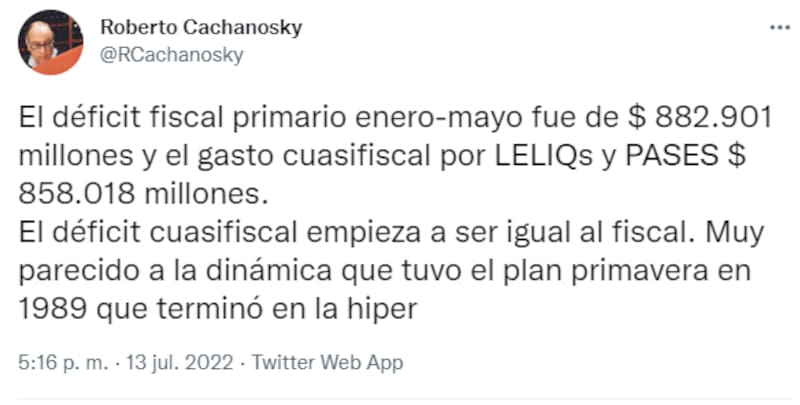 "El déficit cuasifiscal empieza a ser igual al fiscal. Muy parecido a la dinámica que tuvo el Plan Primavera en 1989 que terminó en la hiper", insistió Cachanosky, al trazar el paralelismo con el programa impulsado durante el gobierno de Raúl Alfonsín, en agosto de 1988 y que implosionó meses más tarde en una espiral hiperinflacionaria.