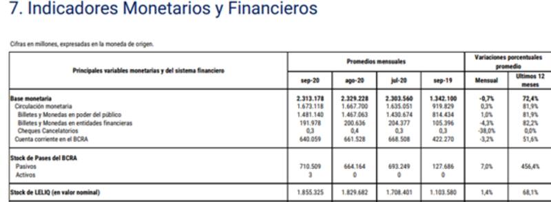 El último informe monetario del BCRA reveló que la base monetaria creció un 72,4% para ubicarse en $ 2,3 billones a fines de septiembre desde los $ 1,34 billones de hace un año.