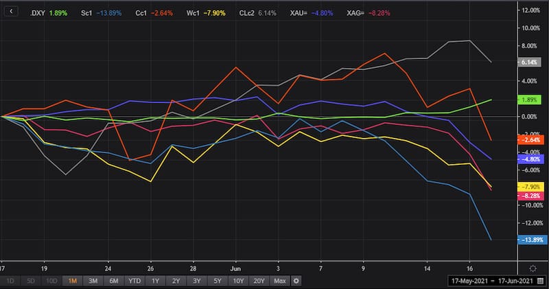 Las materias primas y el dólar suelen tener correlación negativa. Esto significa que el rally en el dólar tiende a venir asociado también a una caída en las materias primas. Con la suba del billete, de casi 2% en el último mes, la soja se desplomó 13,9%, y el trigo y el maíz cayeron 8% y 6% respectivamente. El oro y la plata, por su parte, acumulan bajas respectivas de 4,6% y 8,2%. El petróleo, a contramano, logró subir 6%.