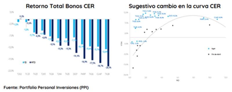 Todos los tramos de la curva de bonos CER están enfrentando un contexto muy negativo. La parte más corta cae entre 5% y 9% en las últimas semanas, mientras que el extremo más largo muestra pérdidas mayores al 20%.