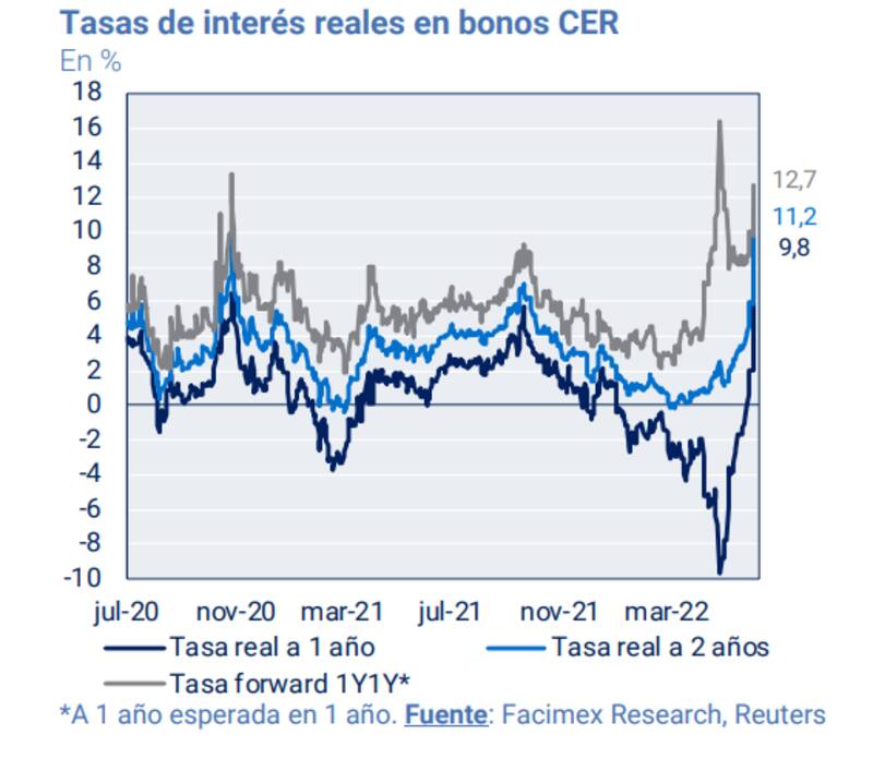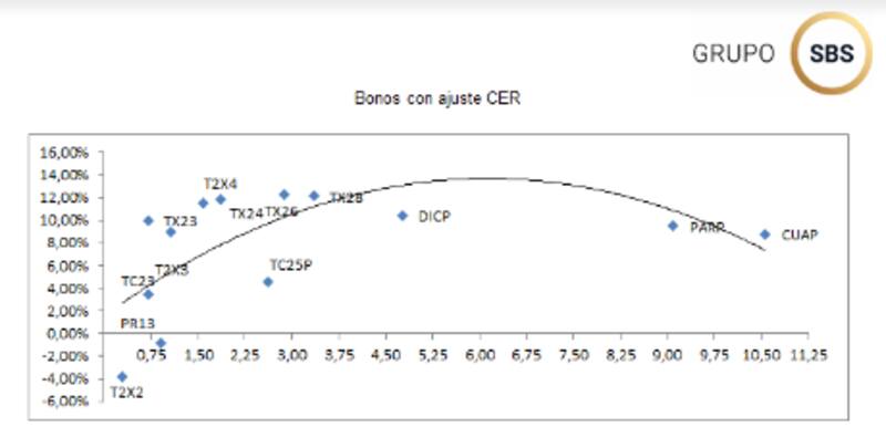 Los rendimientos de toda la curva CER se dispararon abruptamente. El tramo corto pasó de rendir cerca de -20% y hoy rinde apenas -4%. Los bonos de 2023 a 2026 rinden entre 4% y 13%, mientras que la deuda más larga rinde entre 12% y 8%.