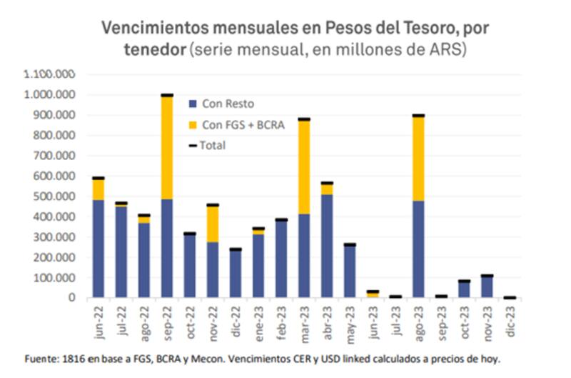Hasta diciembre vencen $ 3,57 billones y a marzo de 2023 vencen $ 5,2 billones, por lo que es necesario que el Tesoro pueda pasar la barrera de las elecciones para poder evitar que la misma siga operando con mayor estrés.