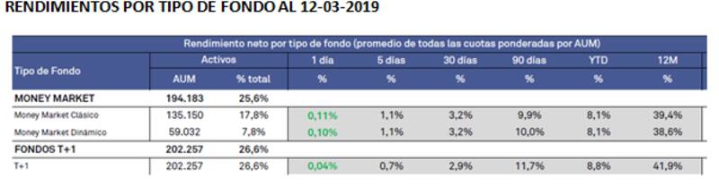 En lo que respecta al rendimiento, Skladnik agregó que, en lo que va del año le compitieron muy de cerca al rendimiento de los plazos fijos, dado que los FCI pueden acceder a tasas mayoristas y la remuneración de las disponibilidades es a tasas muy atractivas. Como referencia, al 12-03-19 estos FCI rindieron en promedio 39,73% TNA en lo que va del año.