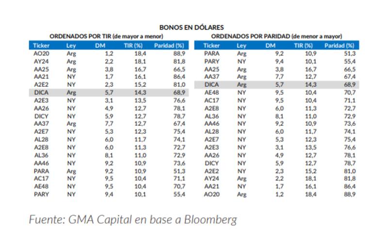 En GMA Capital coinciden, ya que en el último informe semanal señalaron que "sobresalen los bonos que tengan una buena combinación de rendimiento, paridad y potencial de apreciación", y especificaron que con esta premisa, las características del Discount en dólares ley argentina (DICA) resultan atractivas.