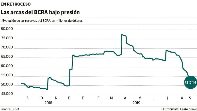 Las reservas del BCRA cerraron ayer en u$s 51.744 millones, u$s 405 millones menos que el día anterior y u$s 14.565 millones por debajo del nivel que mostraban antes de las PASO. Las intervenciones de la entidad conducida por Guido Sandleris en el mercado de cambios explican una parte del sacrificio de reservas, como así también el pago de deudas como el vencimiento de Letes y la cancelación de un repo con bancos por más de u$s 3000 millones.