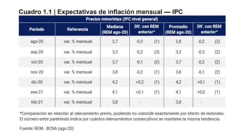 Por último, quienes participan del REM pronosticaron para septiembre una tasa Badlar de bancos privados de 30,10%, con una tendencia creciente en los próximos meses hasta 32,90% en diciembre de 2020.