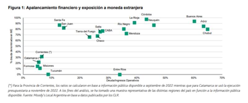 Según las métricas de Moodys, las provincias con mayor exposición a deuda en moneda extranjera son Córdoba, Buenos Aires, La Rioja, Santa Fe, San Juan, Neuquén y Jujuy.