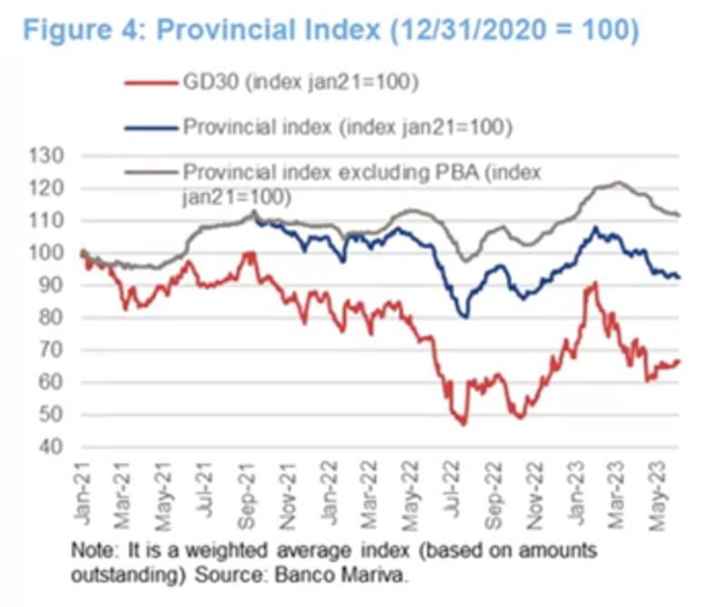 En los últimos meses, el índice de bonos provinciales (excluyendo Provincia de Buenos Aires) elaborados por Banco Mariva cayó 10% y 16% si se incluye la deuda de Provincia de Buenos Aires.