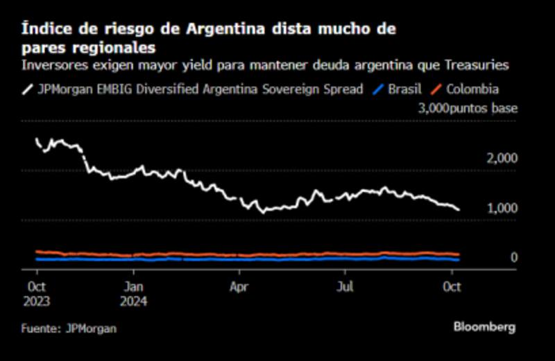 El riesgo país de la Argentina dista mucho de pares regionales, sostuvo Bloomberg, quien asegura que los inversores exigen unos 1204 puntos básicos de rendimiento adicional para mantener los bonos soberanos argentinos sobre los bonos comparables del Tesoro de Estados Unidos, según un índice de JPMorgan que es un indicador habitual de riesgo país.