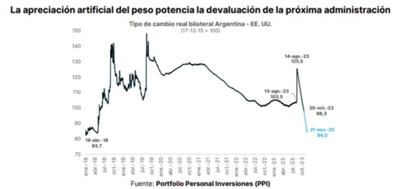 Los analistas de Portfolio Personal Inversiones (PPI) sostuvieron que, en caso de sostenerse el tipo de cambio en $350 hasta la segunda vuelta, el peso estará más que artificialmente apreciado en el mercado oficial.