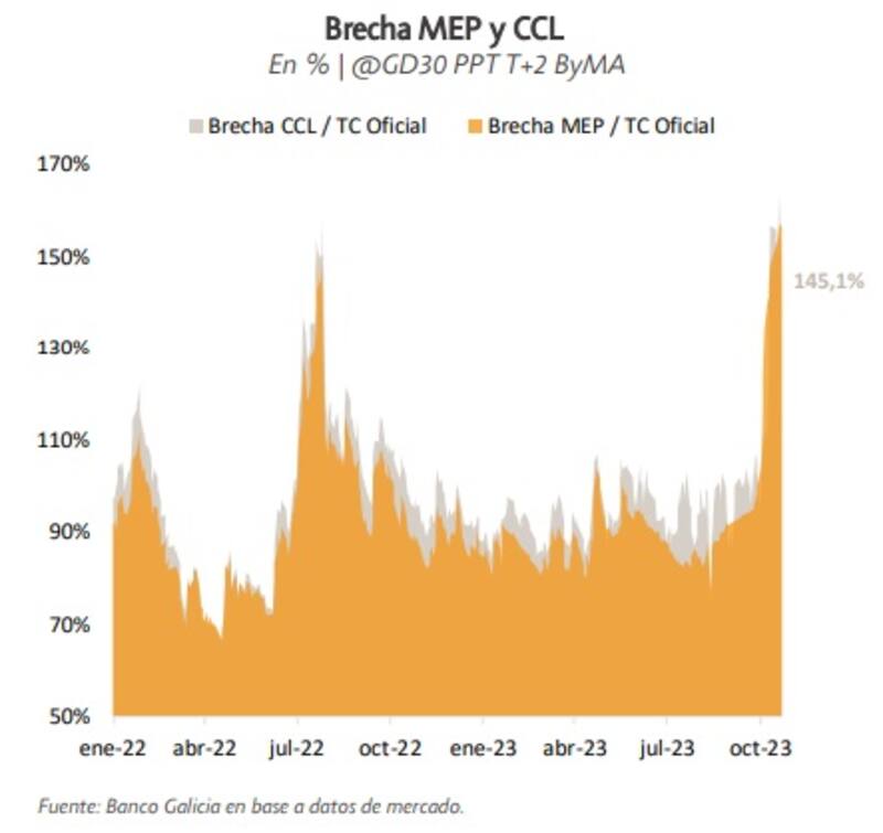 En paralelo, no mover el oficial mientras se dispara el tipo de cambio financiero provoca una ampliación de la brecha cambiaria, la cual alcanzó récords de este siglo de 215%, para luego moderarse en el 167% tras la baja del lunes.