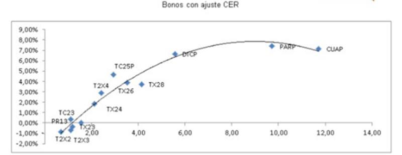 "Si el BCRA comienza a ser más agresivo en su política monetaria, ya sea con una devaluación más acelerada o subiendo más la tasa de interés, es probable que la curva CER vuelva a tener rendimientos positivos", estimaron desde la compañía.