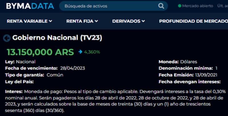 El bono TV23 que sigue la cotización del dólar oficial sube 4,3% en la apertura. En los primeros movimientos del día, llegó a operar con subas de hasta 6%.