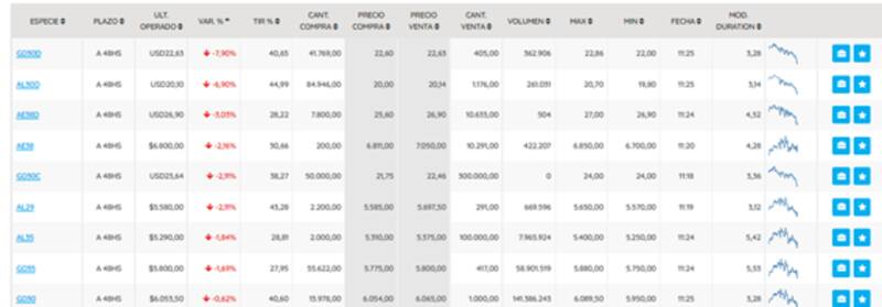 La deuda en dólares inicia la semana con una ciada mayor al 7%. Sin Wall Street como referencia, el Global 2030 cae 7,9%, seguido por el bono de ley local AL30 que baja 6,9%.