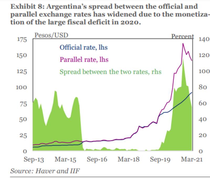 Según datos presentados por el IIF, dadas las restricciones para acceder a dólar a través de los canales oficiales, los inversores y ahorristas minoristas en Argentina recurrieron cada vez más al mercado paralelo. Asimismo, la monetización del gran déficit fiscal (8,5% del PIB en 2020) se ha manifestado en el mercado cambiario.