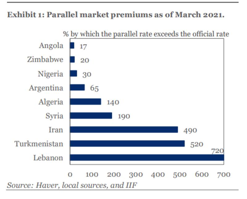 El ranking lo lidera Líbano con una brecha del 720%, seguido por Turkmenistán (520%), luego Irán (490%), Siria (190%), Argelia (140%) y la Argentina. Le siguen luego Nigeria, Zimbabue y Angola con un diferencial de 30%, 20% y 17% respectivamente.