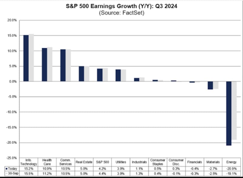Según datos de Factset, se espera que 10 de los 11 sectores que integran el S&P500 informen un crecimiento interanual de sus ingresos para el tercer trimestre de 2024 del 4,7% en promedio.