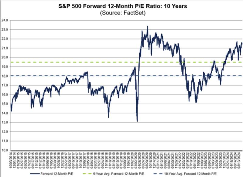 El ratio P/E forward a 12 meses se ubica en 21 veces ganancia, cuando el promedio de 5 años es de 19,5 veces ganancia y el promedio a 10 años es de 18 veces ganancias.