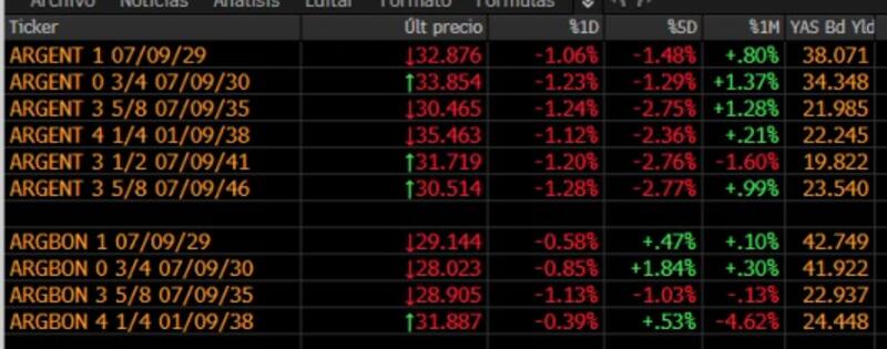 Todos los tramos de la curva argentina operan en negativo el miércoles. Los Globales a 2029 y 2030 retroceden 1,06% y 1,23%, mientras que los bonos del tramo medio bajan 1,24% y 1,1% en los Globales a 2035 y 2038.
