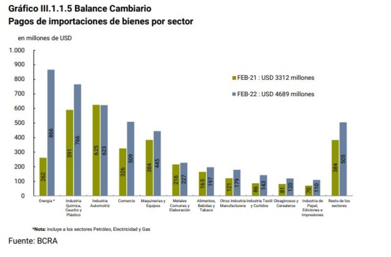La salida de dólares por pagos de importaciones de energía creció un 230,53% en febrero respecto a un año atrás y ya es el principal rubro en egreso de divisas por compras al exterior, según marca el último informeEvolución del Mercado de Cambios y Balance Cambiario que elabora el Banco Central (BCRA).