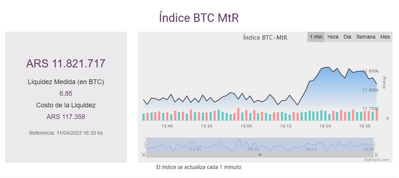 De acuerdo con la definición de Matba Rofex, el Índice BTC MtR es un indicador financiero que refleja el precio de mercado para una determinada cantidad de Bitcoin ("Liquidez Medida"), expresado en Pesos Argentinos por Bitcoin (par BTC/ARS), en los Proveedores de Precio en la República Argentina.