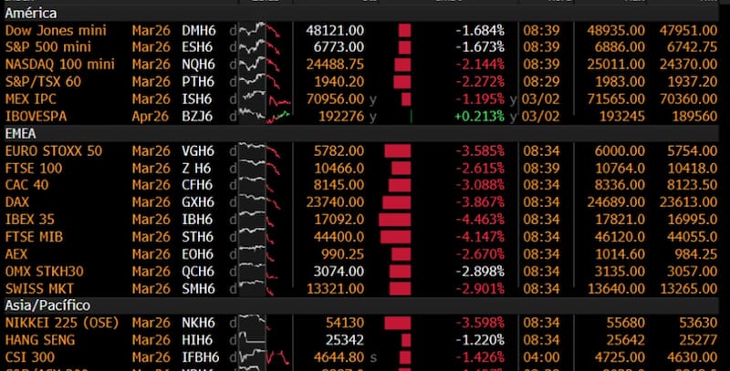 La ola de ventas en las acciones se profundizó y el dólar se fortaleció el martes, ya que la creciente conflictividad en Oriente Medio impulsó un aumento repentino en los precios de la energía, lo que aumentó la preocupación de los inversores sobre su impacto en la economía mundial.