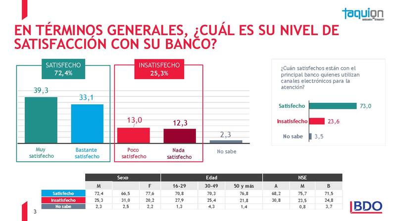 El estudio de BDO y Taquion también indagó en los niveles de satisfacción de los clientes con la atención que reciben de parte de su banco. El 72% se mostró satisfecho (33,1%) o muy satisfecho (39,3%), mientras que el 25,3% dijo estar disconforme