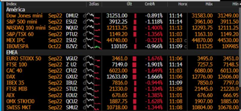 De esta manera, Wall Street opera a la baja por quinto día consecutivo y vuelve a acercarse a terreno de bear market. El índice tecnológico Nasdaq muestra una baja del 25,5% desde sus máximos mientras que el S&P500 pierde 17,5% desde sus máximos recientes.