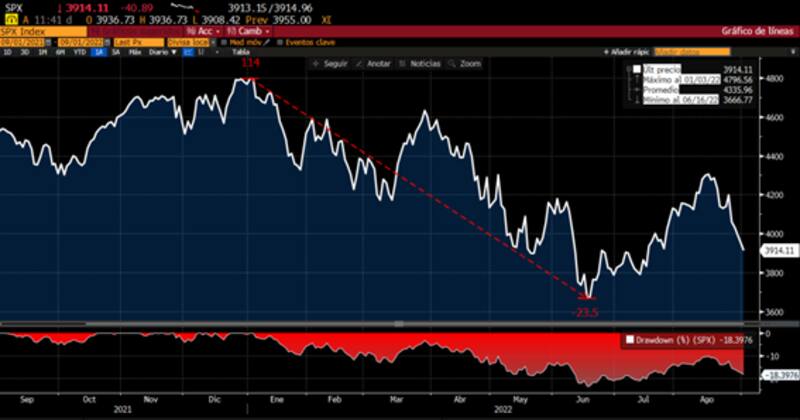 Las acciones y la deuda internacional retroceden en medio de mayores temores recesivos en los EE.UU. a causa de una Reserva Federal más hawkish. El índice tecnológico Nasdaq muestra una baja del 25,5% desde sus máximos mientras que el S&P500 pierde 17,5% desde sus máximos recientes.