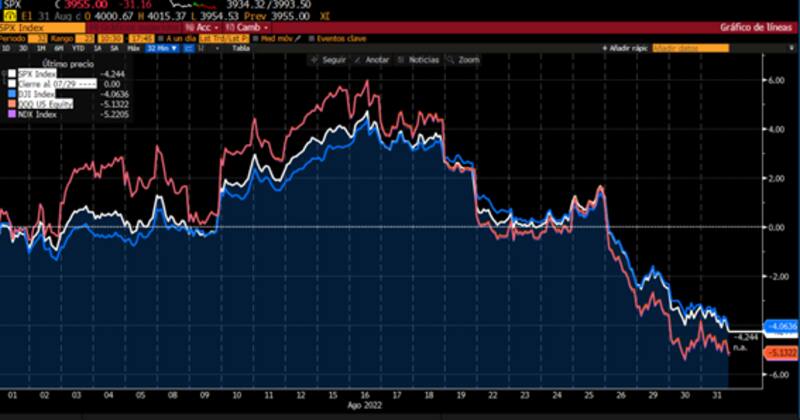 El S&P500 cayó 4,2% en agosto, el Dow Jones bajó 3,9% y el Nasdaq retrocedió 5,1%. En todos los casos, fue el peor mes desde junio ya que julio había arrojado ganancias del 12% para el Nasdaq y del 9% para el S&P500.