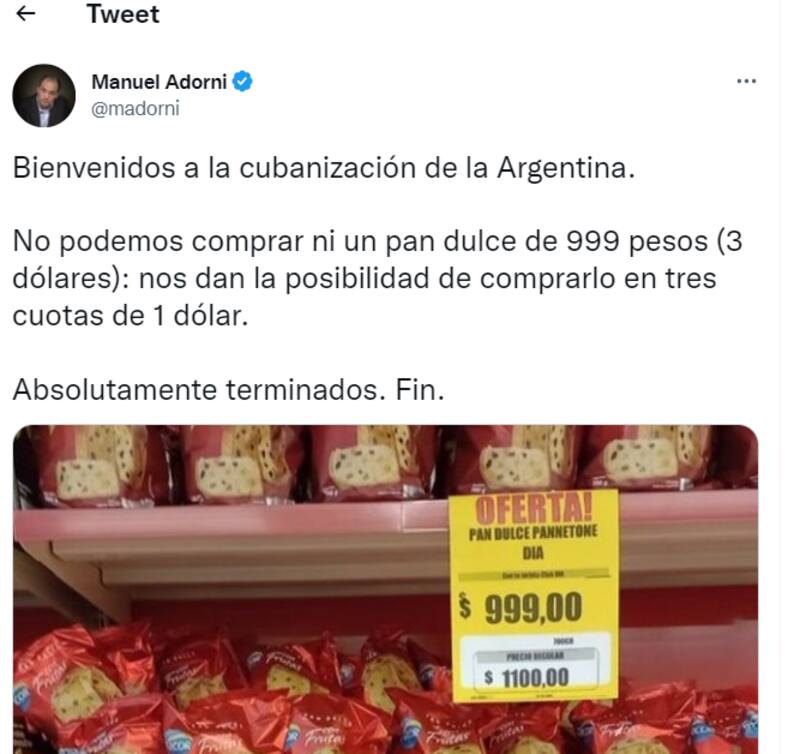 "Bienvenidos a la cubanización de la Argentina", abrió su hilo el periodista económico Manuel Adorni. Y continuó: "No podemos comprar ni un pan dulce de 999 pesos (3 dólares): nos dan la posibilidad de comprarlo en tres cuotas de 1 dólar. Absolutamente terminados. Fin".