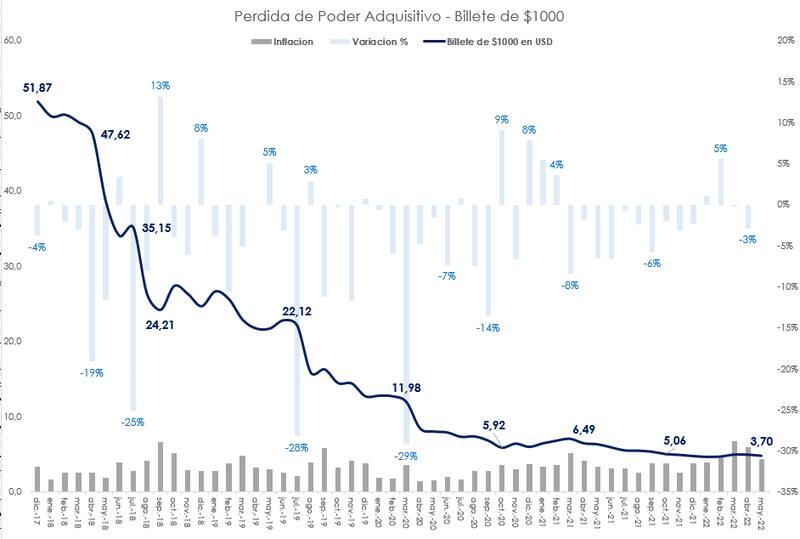 Emitido en noviembre del 2017, 54 meses atrás, el billete llegó a las calles con un valor equivalente a u$s 51,87. Pero hoy, ajustado en dólares el valor llegó a u$s 3,70.
