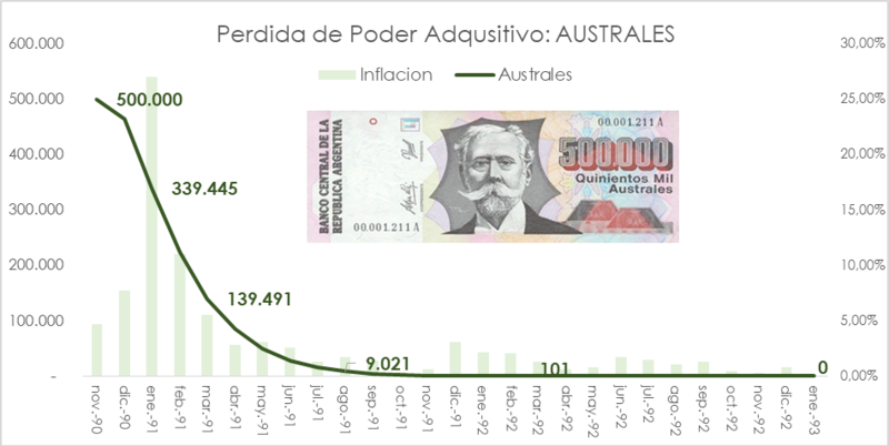 En tercer lugar quedó el recordado billete de 500.000 australes. "En ese entonces el billete de mayor denominación fue 500.000 australes, el cual tuvo su primera emisión en noviembre de 1990 y con una fecha de desmonetización en enero de 1993, es decir que en 27 meses el austral perdió la totalidad de su valor".