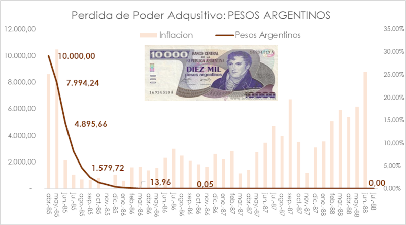 El billete de mayor denominación fue el de 10.000 pesos, que se emitió en abril de 1985. Pero 39 meses después, en julio de 1988 y tras una inflación promedio de 650%, este billete perdió el 100% de su valor.