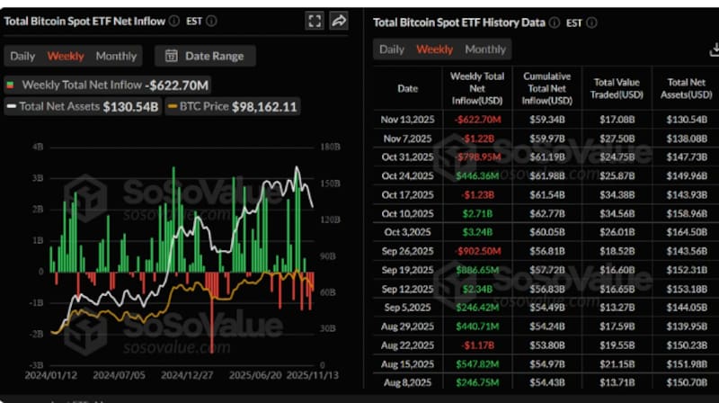 La presión institucional aceleró la venta: los ETF spot de Bitcoin anotaron salidas netas por u$s 622,70 millones en lo que va de la semana, con lo que anota tres semanas al hilo de retiros desde fines de octubre.