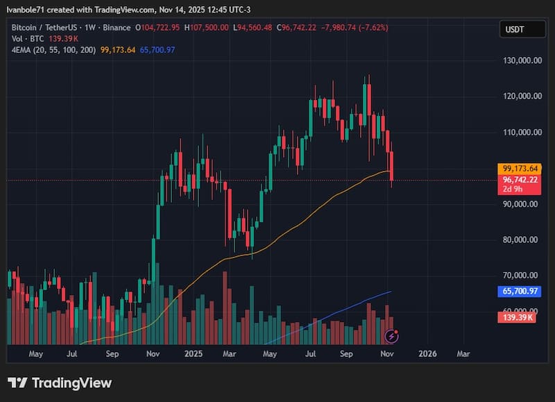La respuesta está en un solo nivel: la EMA55 semanal. Vale la pena recordar que la EMA es la Exponential Moving Average, o media móvil exponencial, un indicador que suaviza los precios y pone más peso en las últimas velas. La EMA55 semanal mide los precios de cierre de las últimas 55 semanas y se usa para detectar tendencias de largo plazo. Es un umbral psicológico y técnico clave.