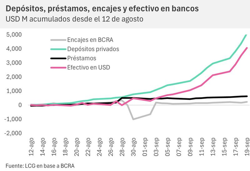 Okseniuk destaca que el 19 de septiembre los depósitos en dólares del sector privado crecieron más de u$s 700 millones, mientras que la liquidez en los bancos aumentó u$s 540 millones, lo que refleja que gran parte de los fondos se están quedando en las sucursales, contabilizados internamente como efectivo.