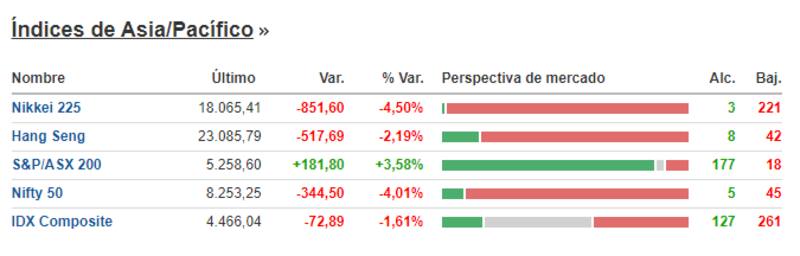 Las bolsas del mundo arrancan abril con el pie izquierdo. Los principales índices de los mercados de Europa cotizan la primera sesión del mes con marcados descensos. En Asia, el índice Nikkei cerró con un retroceso del 4,5%, su nivel más bajo desde finales de 2016, en medio de la fuerte caída de la confianza empresarial a mínimos de siete años.