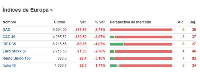 El EuroStoxx 50, referencia en el Viejo Continente, cae bajo los 2.700 puntos. Ayer puso punto y final al que ya es el peor mes de su historia, al igual que para las bolsas de Londres, Madrid y Milán. Los selectivos Ibex 35 español y Ftse Mib italiano fueron los peores parados, con descensos superiores al 22% en el acumulado de marzo.