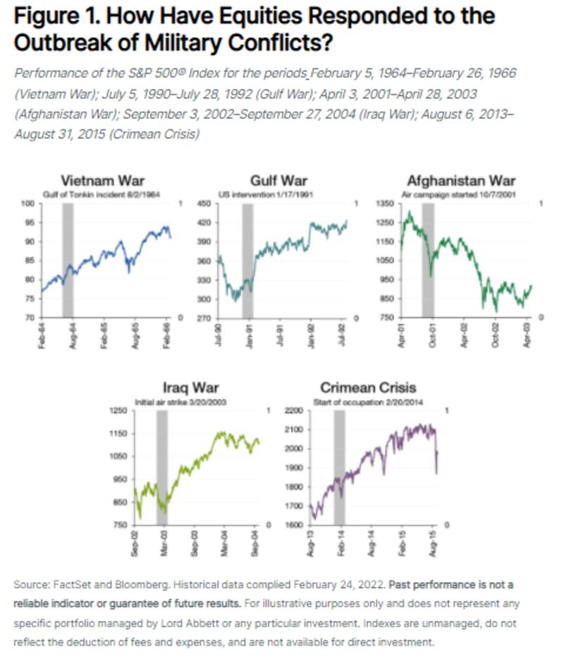 La historia muestra que el inicio de una guerra suele significar una oportunidad de inversión. Salvo en el caso del conflicto en Afganistán, en el resto de los casos recientes de inicio de guerra,las acciones tienen una caída inicial para luego reanudar la tendencia alcista, lo cual implica que la baja actual, motivada por el estallido de la guerra entre Rusia y Ucrania, podría ser una oportunidad de compra.