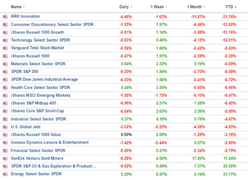 Las pérdidas son lideradas por el ETF de ARK Innovation, que cae 31,8% en 2022, seguido por el sector de consumo discrecional, el tecnológico y el de materiales, con pérdidas de entre 8% y 13%.