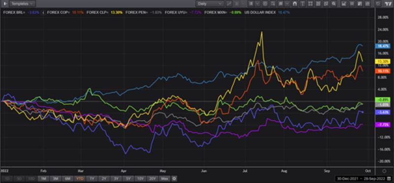 Pese a que el dólar index sube 18,5% en lo que va del año, el real se mantuvo estable este año, mostrando una apreciación de 3,6%. El peso chileno y el peso colombiano se devaluaron entre 10% y 13 por ciento.