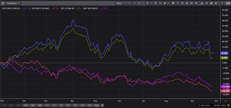 "A diferencia de mercados emergentes y América latina, el riesgo país de Brasil experimentó una compresión de 25pbs en lo que va del año. El EMBI de Brasil experimentó una suba de 92 pb a hasta los 422pbs, mientras que el de Latam lo hizo en 98pbs a 497pbs. La resiliencia relativa de los bonos en dólares de Brasil en lo que va del año los pone en un lugar relativamente menos atractivo contra mercados comparables", dijeron desde Balanz.